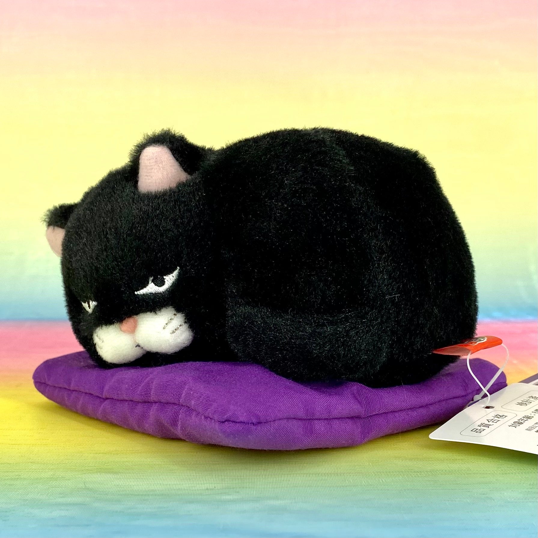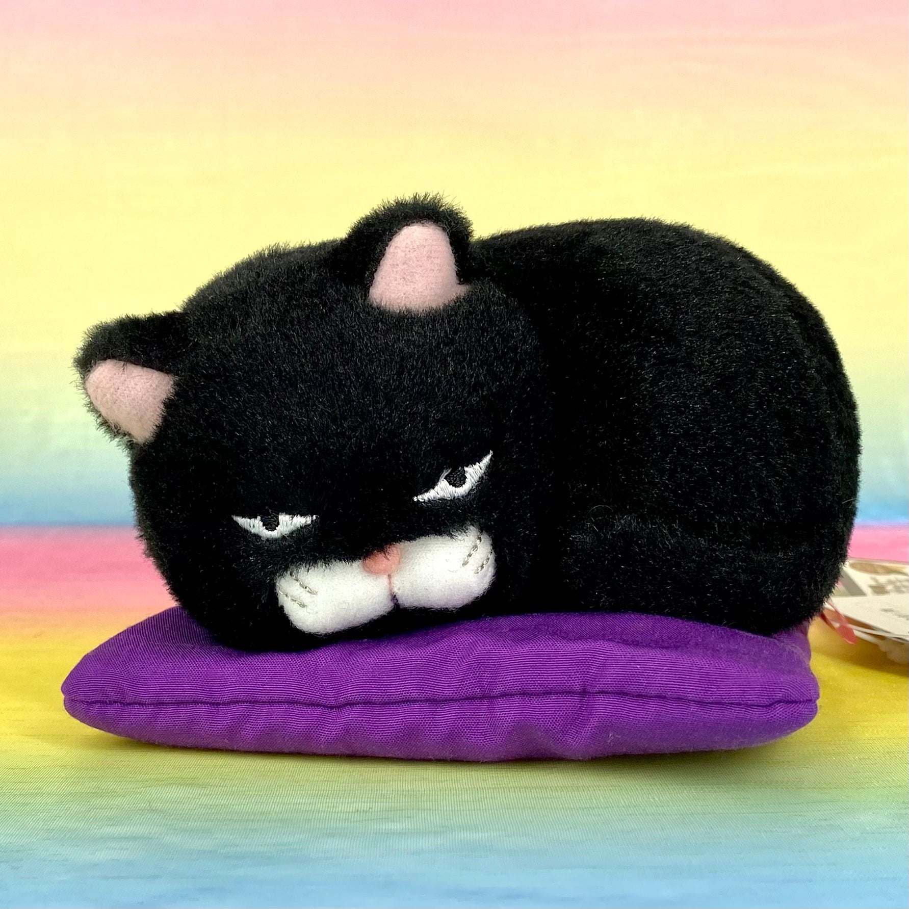 Made with soft glossy fur and pink inside the ears, this black version has a grumpy expression that is too adorable. They are relaxing, curled up on a purple cushion.