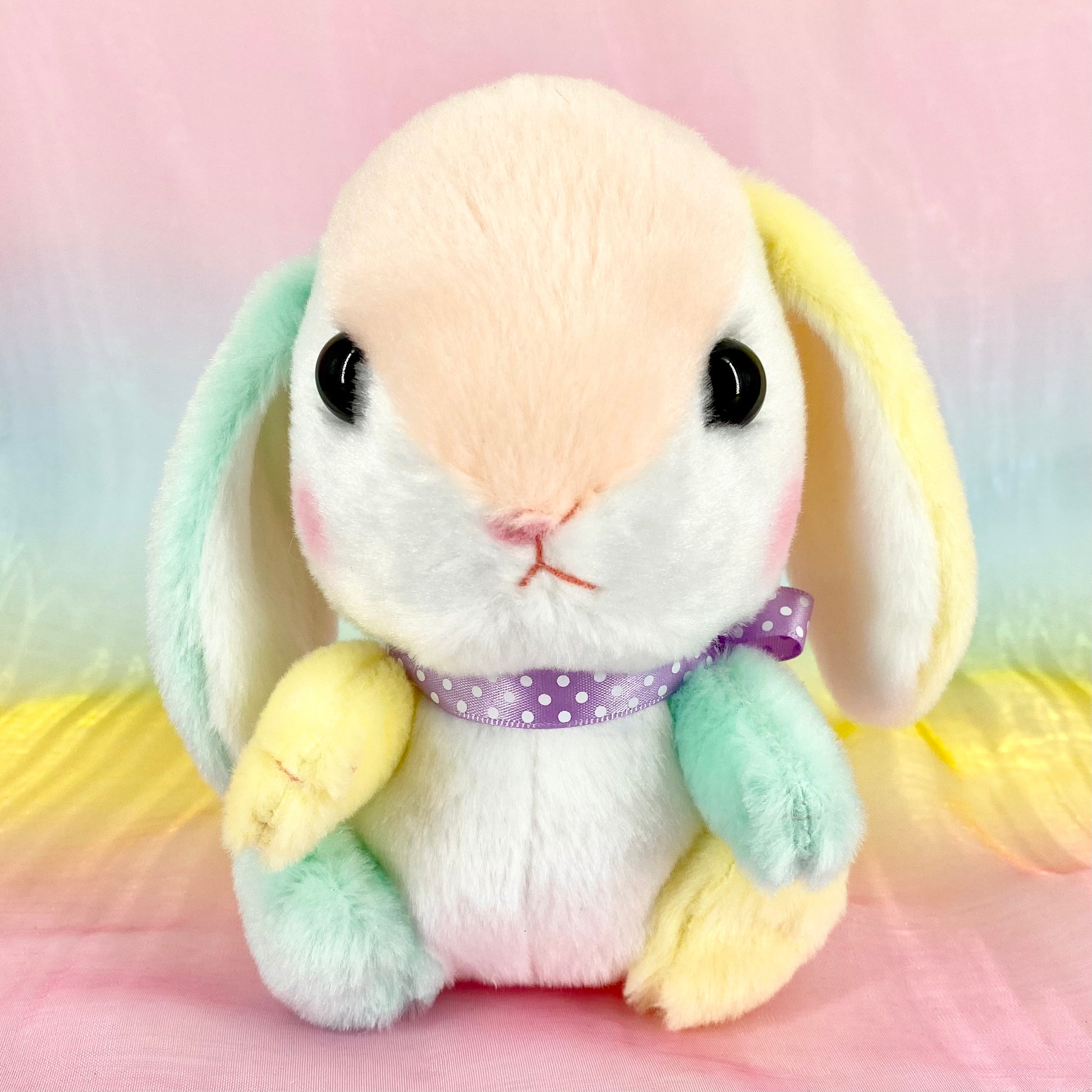 Made with lovely pastel rainbow coloured fur, Loppy has cute rosy cheeks and a beautiful polka dot bow around their neck.