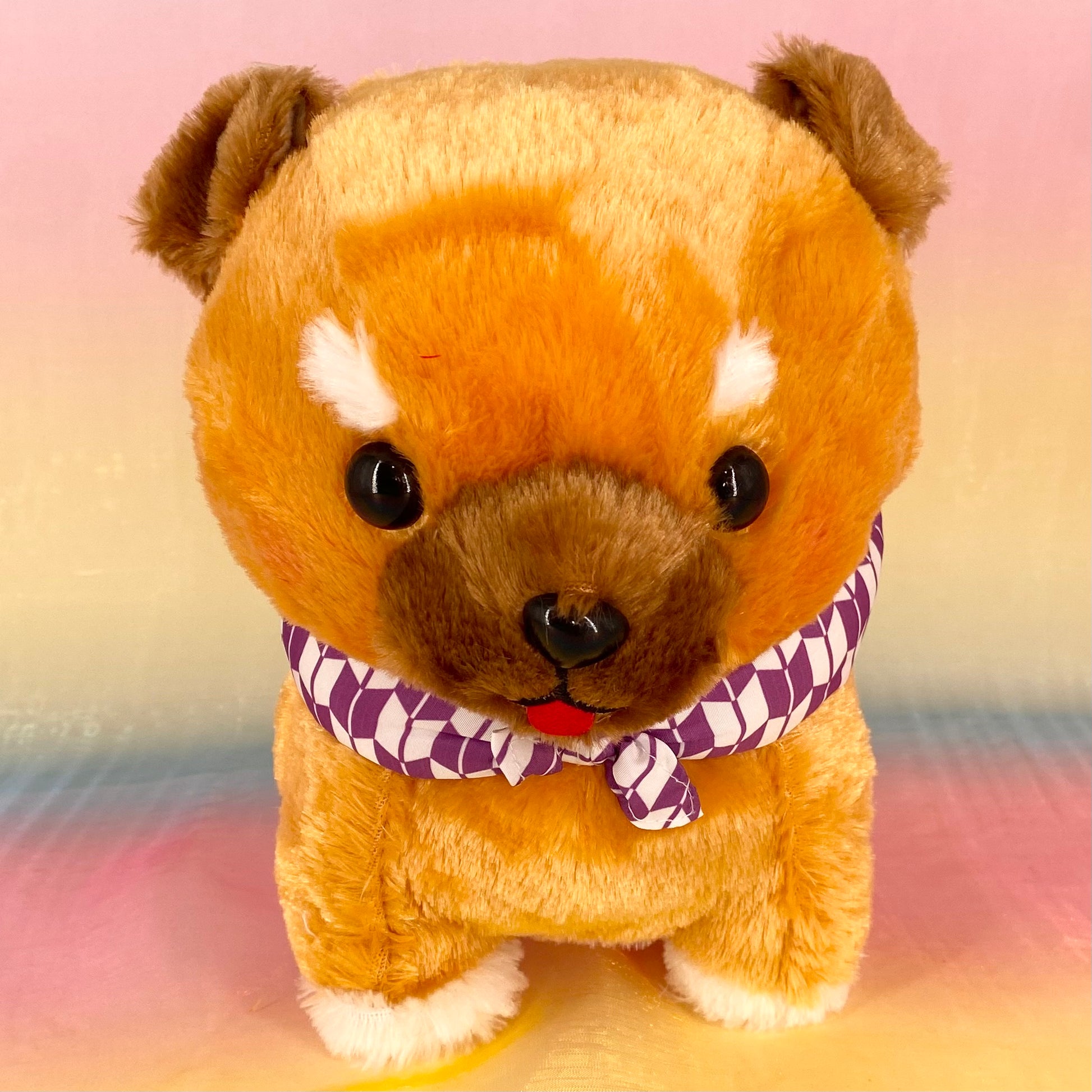 Mameshiba and friends are here wearing snazzy kneckers. Super soft cinnamon, chocolate and white fur, rosy pink cheeks, a patterned purple knecker and the curly tail make this such a gorgeous plushie for all ages.