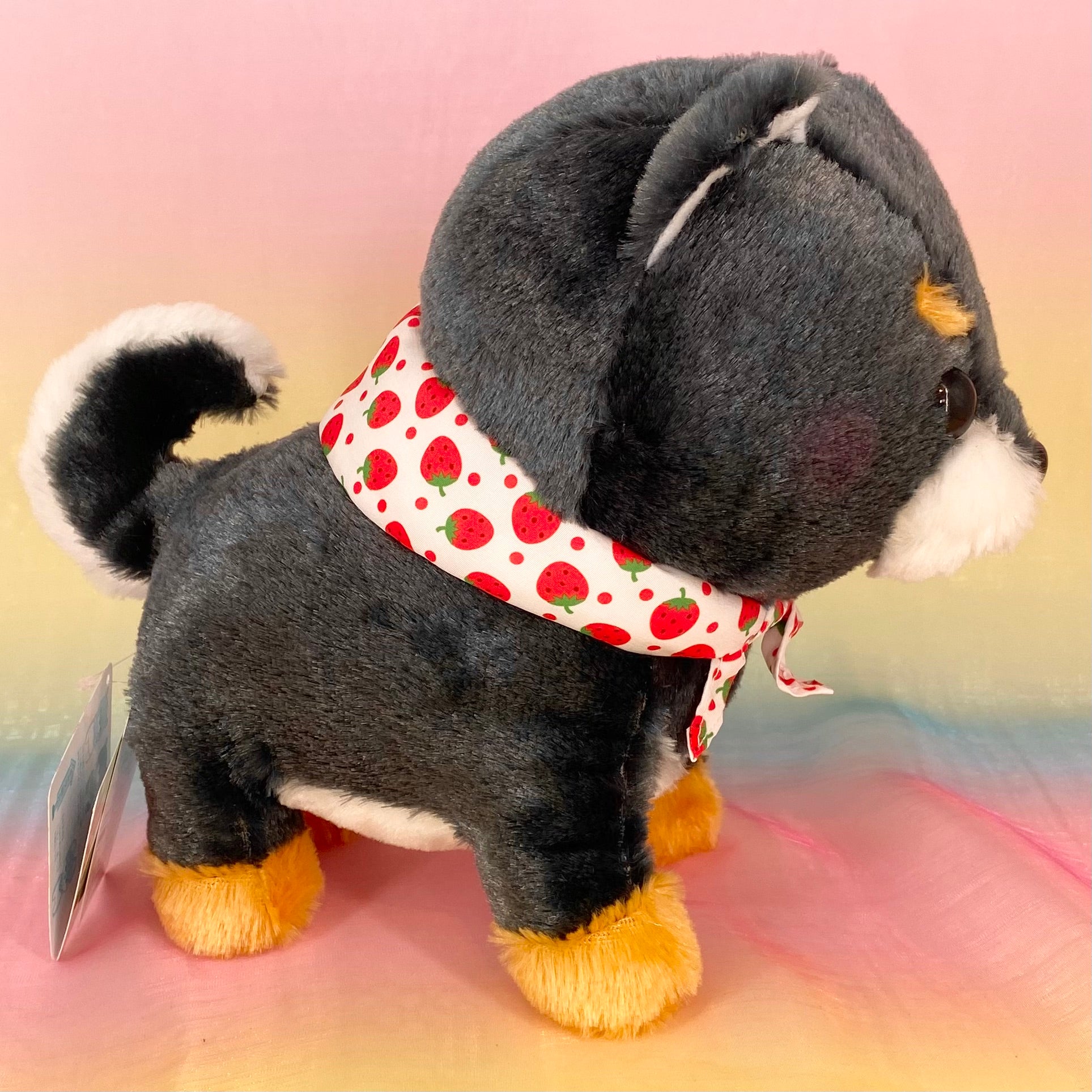 Mameshiba and friends are here wearing snazzy kneckers. Super soft blue/grey, cinnamon and white fur, rosy pink cheeks, a strawberry patterned knecker and the curly tail make this such a gorgeous plushie for all ages.