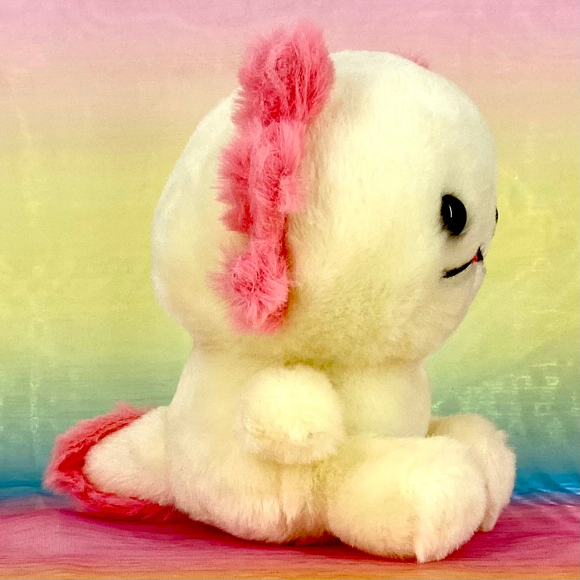 Meet this brand new plush design, a sitting Axolotl. These little creatures are hugely popular right now and this plush version is so adorable. Super soft yellow fur body and a charming tail with pink gills.